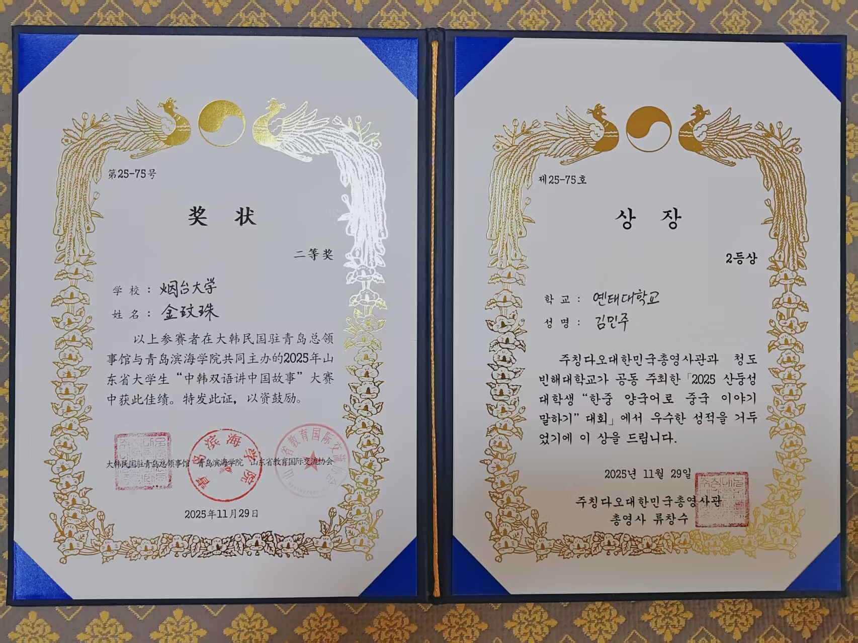 本次大赛由大韩民国驻青岛总领事馆与青岛滨海学院联合主办,吸引全国24所高校的43名选手参赛,首次采用中韩双语形式讲述中国故事,推动跨文化传播实现“双向共鸣”。比赛中,金玟珠以“鲁菜的历史及发展”为主题展开演绎,循着秦代到民国的时间脉络,深挖鲁菜文化底蕴。她以扎实的中韩双语功底、生动的叙事表达,展现了对中国文化的深刻理解和跨文化传播能力,充分彰显了我校留学生的综合素质与青春风采。
